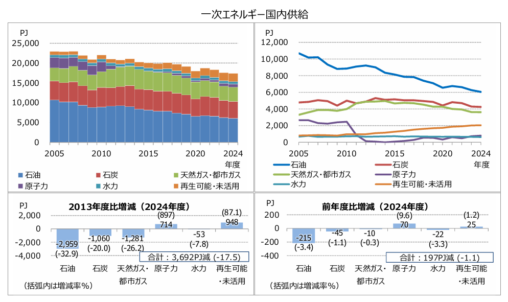 石油、天然ガス、石炭、原子力、水力、その他の再生可能エネルギー、バイオマスなど、自然から直接得ることができるものが「一次エネルギー」であり、海外からの輸入分を含めたものが「一次エネルギー総供給」と呼ばれている。国内備蓄量などを差し引いたものが、「一次エネルギー国内供給」である。