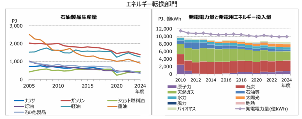 ガソリン・軽油・重油などの「石油製品生産量」は、2024年度は5,101PJで前年度比7.2%減少しており、2010年度以降で最小となった。主力のガソリンは1,385PJで前年度比5.6%減少し、軽油は1,255PJで6.7%減少し、重油は999PJで10.5%減少と、いずれも減少傾向にある。