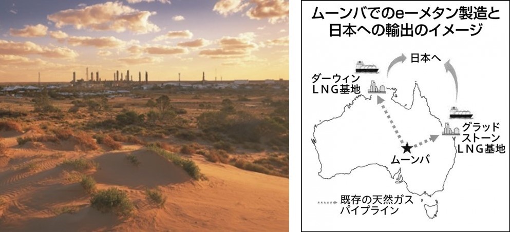 豪州中東部クーパー堆積盆地のムーンバで、ガス田から得られるCO2と、太陽光・陸上風力発電設備を建設してグリーン水素を製造してメタネーションを行う。CO2は、豪州東部からのパイプライン調達も検討する。