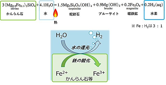 鉄元素が鍵となる化学反応であり、鉄元素を含む多くの岩石(鉱物)でも水素は発生する。