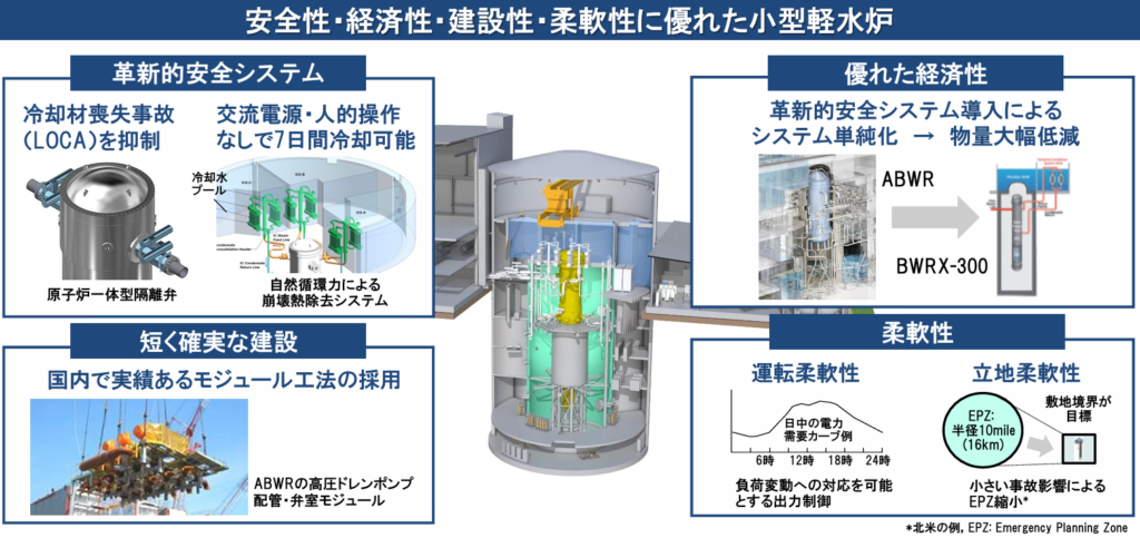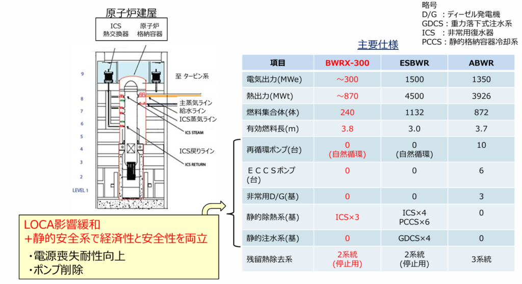 「BWRX-300」の設備や燃料など採用する技術のほとんどは「BWR」や「ABWR」で使用実績があり、最新の「ESBWR( Economic Simplified Boiling Water Reactor)」でも採用された静的な安全系システムなど、米原子力規制委員会(NRC)で設計認証済みの技術を活用して、早期に実用化している。