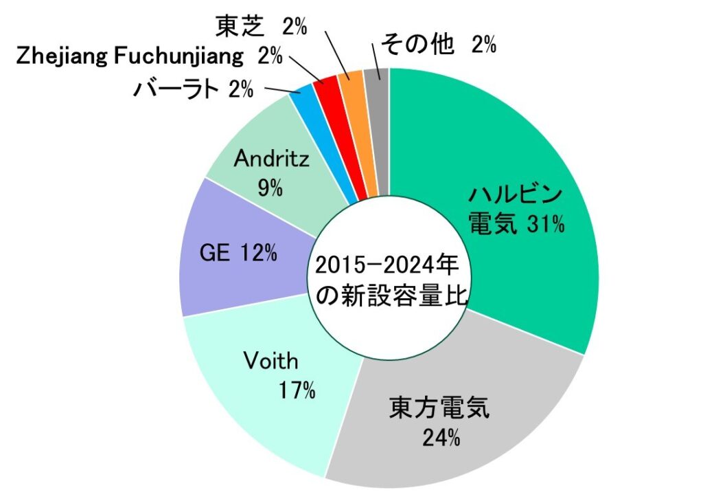 特に、ハルピン電機集団、東方集団、浙江福春江水力発電設備を加算すると、中国企業が世界市場の57%のシェアを占めている。