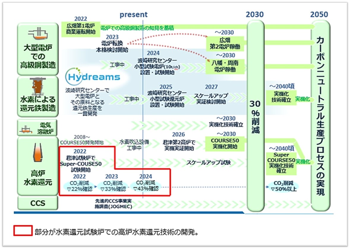 一方、2022年5月、東日本製鉄所君津地区の水素還元試験炉(内容積:12㎥)で、加熱した水素を使用してCO2を削減する技術(Super COURSE50技術)の試験を開始している。