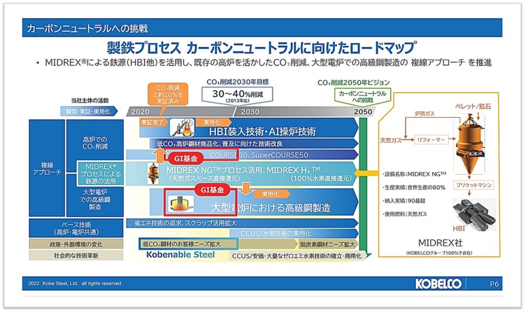 2022年9月、KOBELCOPグループの中期経営計画(2021~2023年度)において、製鉄プロセスのカーボンニュートラルに向けたロードマップを示している。