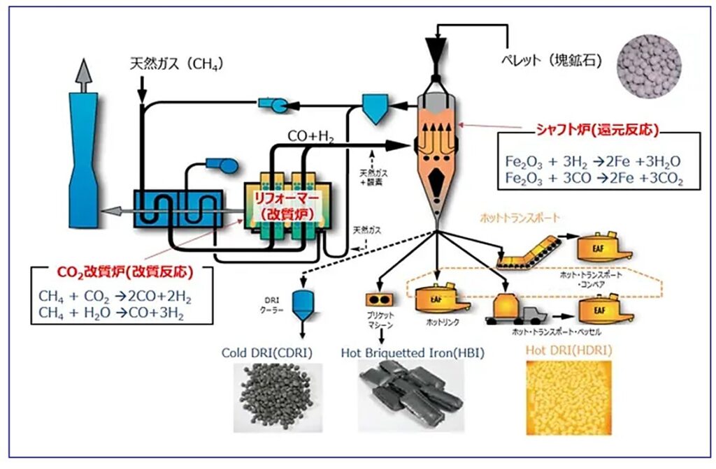 ■天然ガス(主にCH4)を還元材とし、粉鉱石を加工したペレットを使ってシャフト炉で還元鉄を製造し、ミドレックス技術により高温の還元鉄を運搬に適する大きさの熱間成形還元鉄(HBI)にして高炉へ移送する。