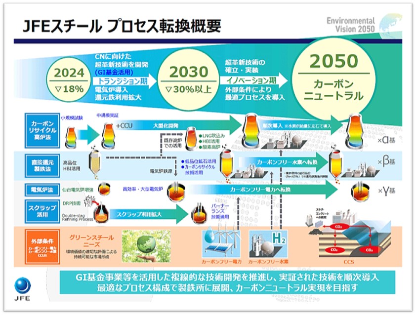 2021年5月、2050年カーボンニュートラルの実現をめざした「JFEグループ環境経営ビジョン2050」を公表した。①「電炉」+スクラップ活用、②水素による「直接還元製鉄」+電気溶解炉、③「カーボンリサイクル高炉」+CCUSにより、カーボンニュートラル生産プロセスの実現をめざす。